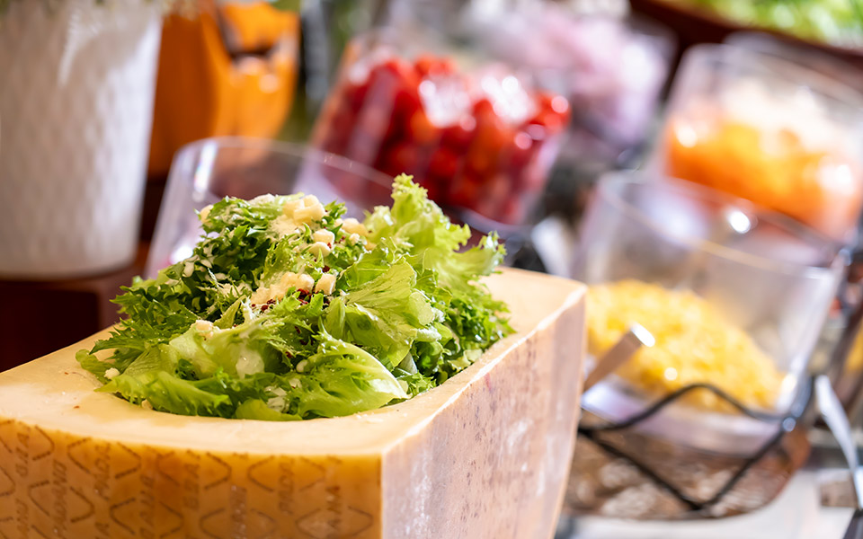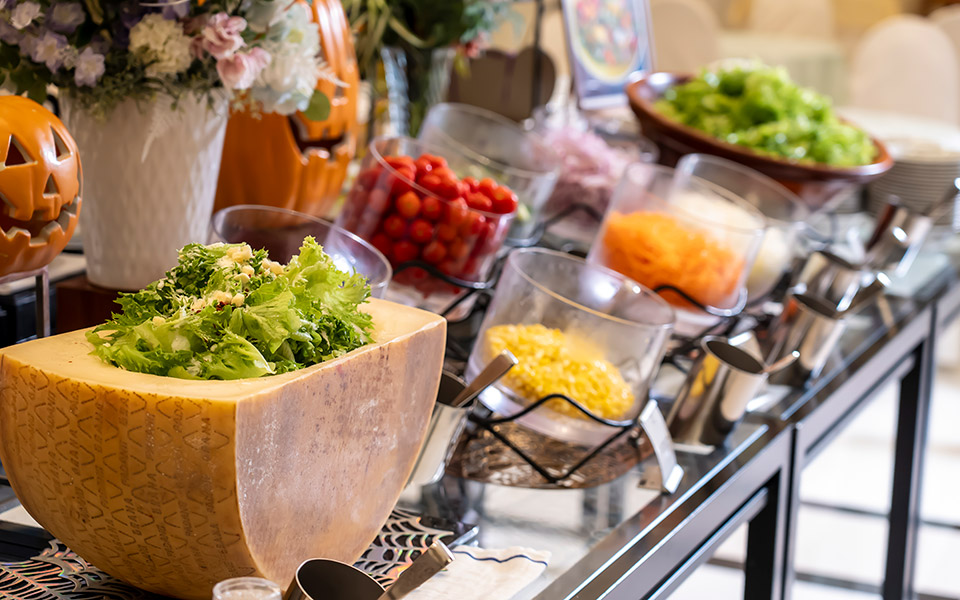 イタリアチーズの王様「パルミジャーノ・レッジャーノ」の器が魅力のシーザーサラダをはじめ、ニンジン、キャベツ、プチトマトなど野菜の種類も豊富です。サラダコーナーには、カラダに嬉しいドレッシングやイタリア バルベーラ社がとり扱う高級ラインのエキストラ・ヴァージン・オリーブオイルなども味わっていただけます。