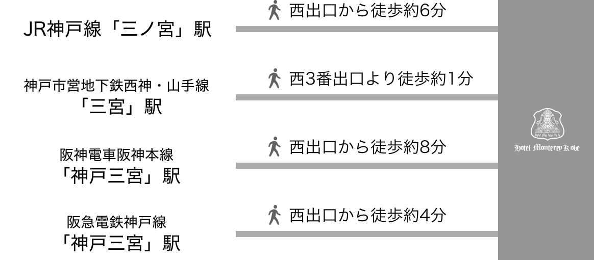 JR「三ノ宮」駅より徒歩6分、地下鉄「三宮」駅より徒歩1分。