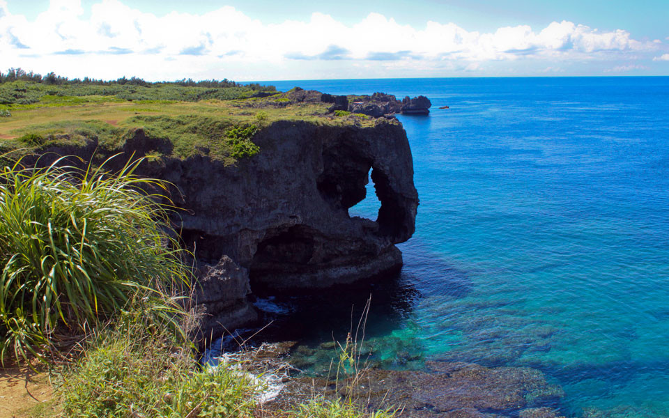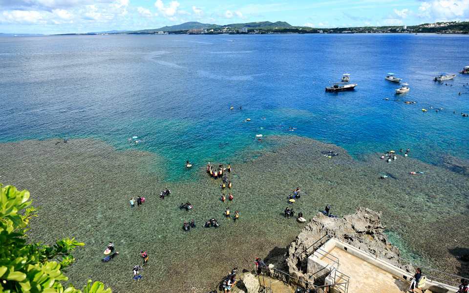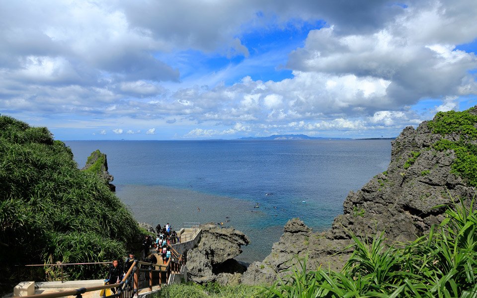 真栄田岬はコバルトブルーな西海岸に面し、青の洞窟、シュノーケリング及びスキューバーダイビングが楽しめる場所として有名。全国的に有名な「青の洞窟」は神秘的な青の世界で、多くのダイバーを魅了しています。2月~4月には、北上する鯨を展望台から観察することが出来ます。