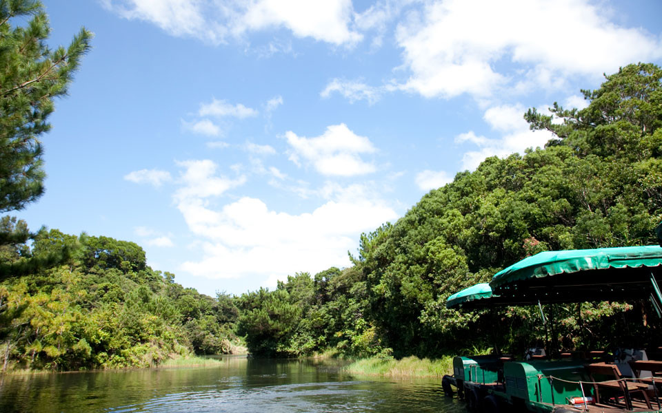沖縄本来の森や山々の自然、美しいランの花々がテーマの自然植物園。巨大なシダが生い茂る森、野鳥や昆虫が集まる水辺、自然のままに育まれるランの花々と、濃厚な亜熱帯の森が広がっています。散策路を歩いたり、湖水観賞舟に乗って豊かな自然を満喫。園内の大龍池で運航される湖水観賞舟は、25分間のジャングルクルーズ。船頭が、湖畔の植物や花々、小動物などについて楽しく案内してくれます。