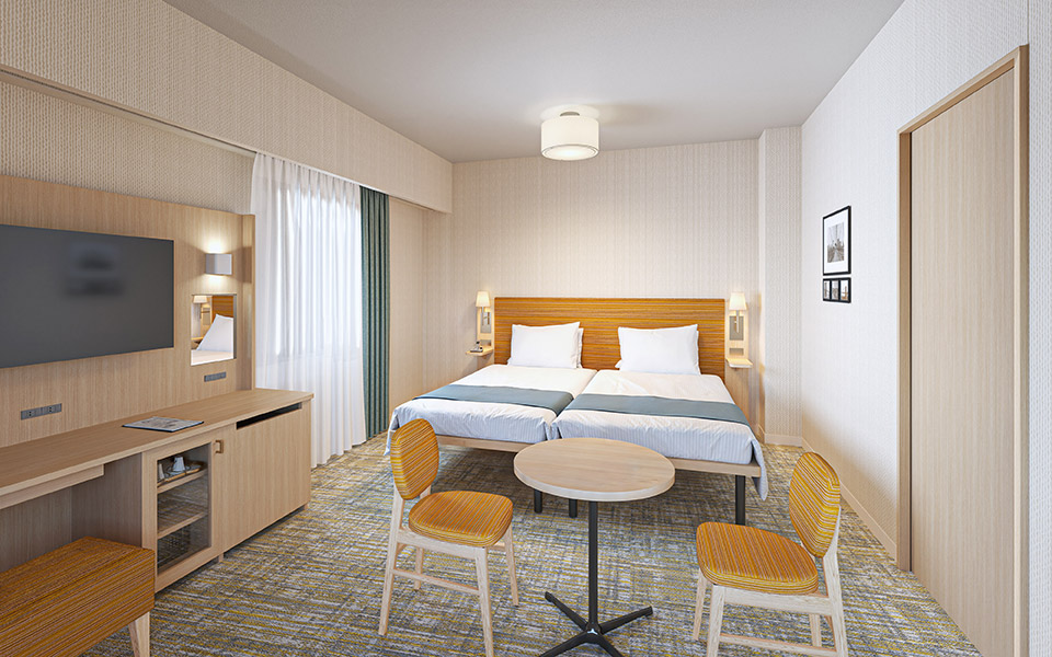 客室内標準設備 客室内標準設備 ミラブルシャワーヘッド、スマートTV、ドライヤー、パジャマ(セパレートタイプ)、スリッパ、室内電話、Wi-Fi接続(無料)、ライティングデスク、レターセット(便箋、封筒)、ランドリーバック、ポット、冷蔵庫、洗浄器付トイレ、空調(冷暖房完備)、ハンガー、靴磨き、靴べら ※2025年10月時点の情報となり、変更になる場合がございます。