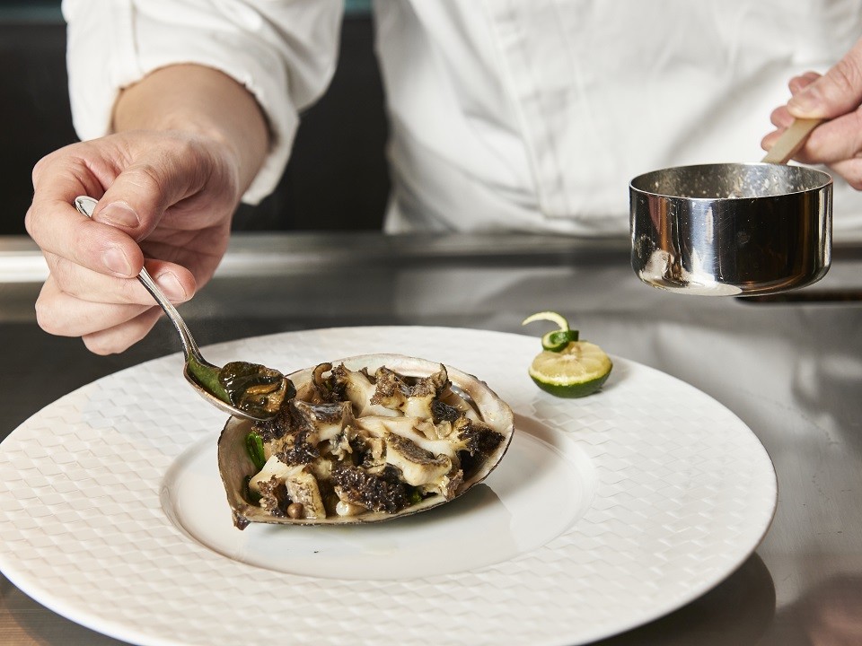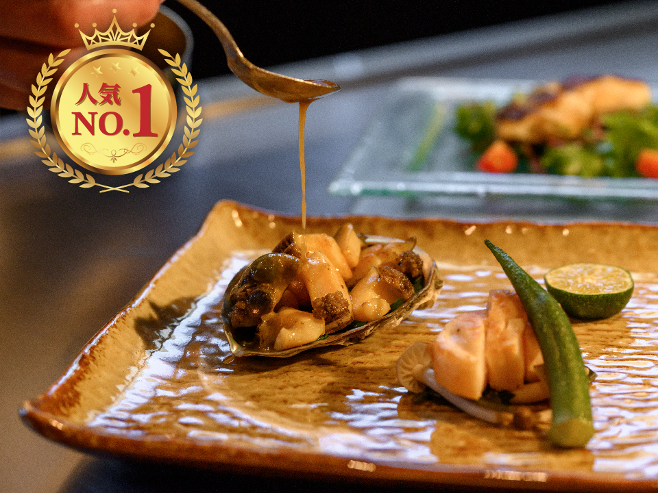 - 活あわびと帆立貝柱のソテー